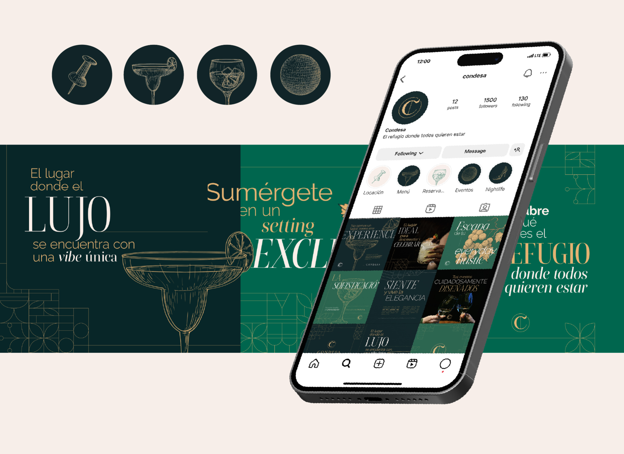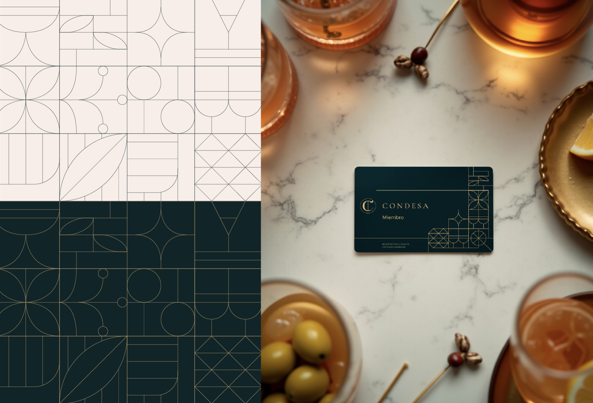 Condesa es un proyecto de branding para un espacio exclusivo que combina lujo, sofisticación y aspiración. El concepto fue crear una identidad percibida como un refugio chic, “el sitio donde todos quieren estar”.