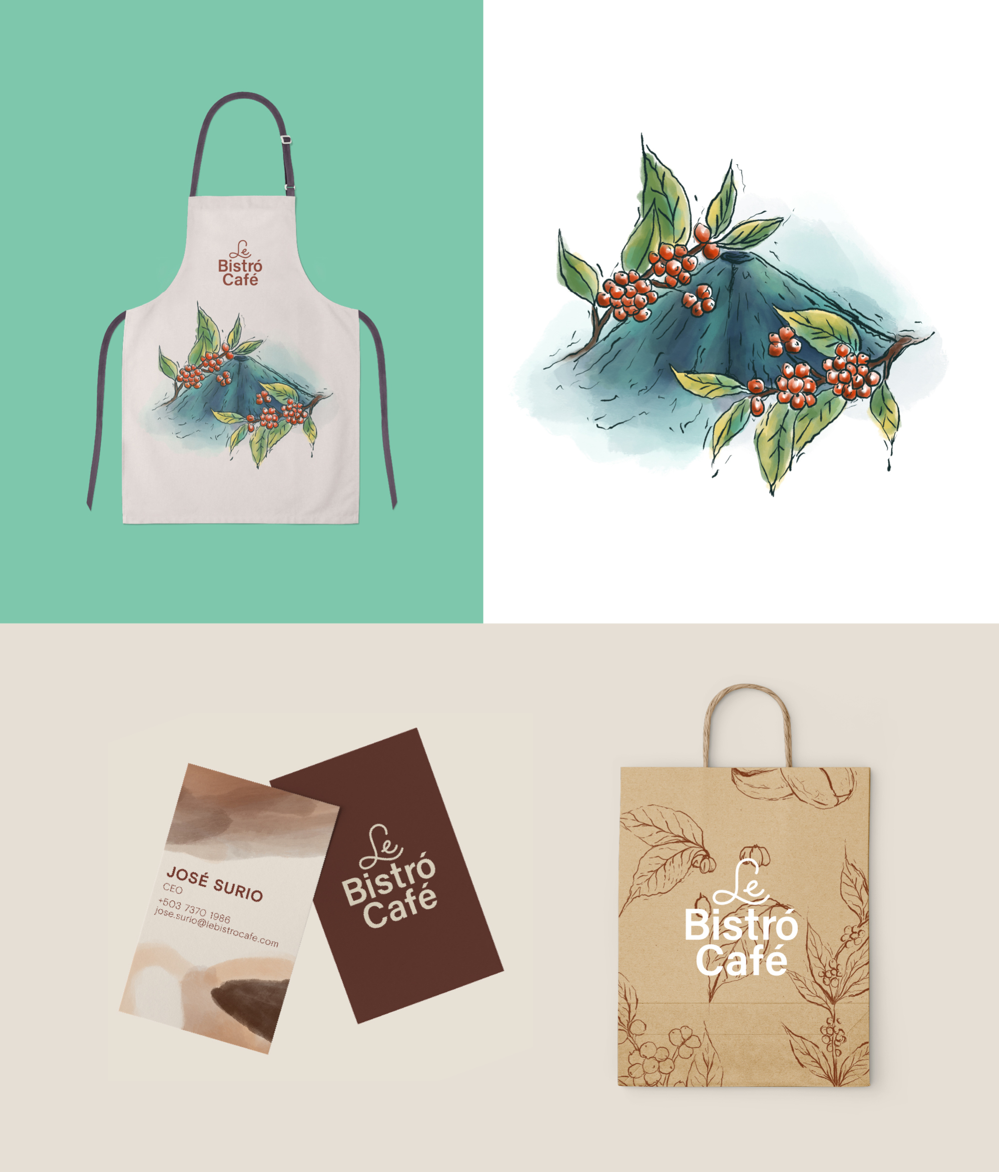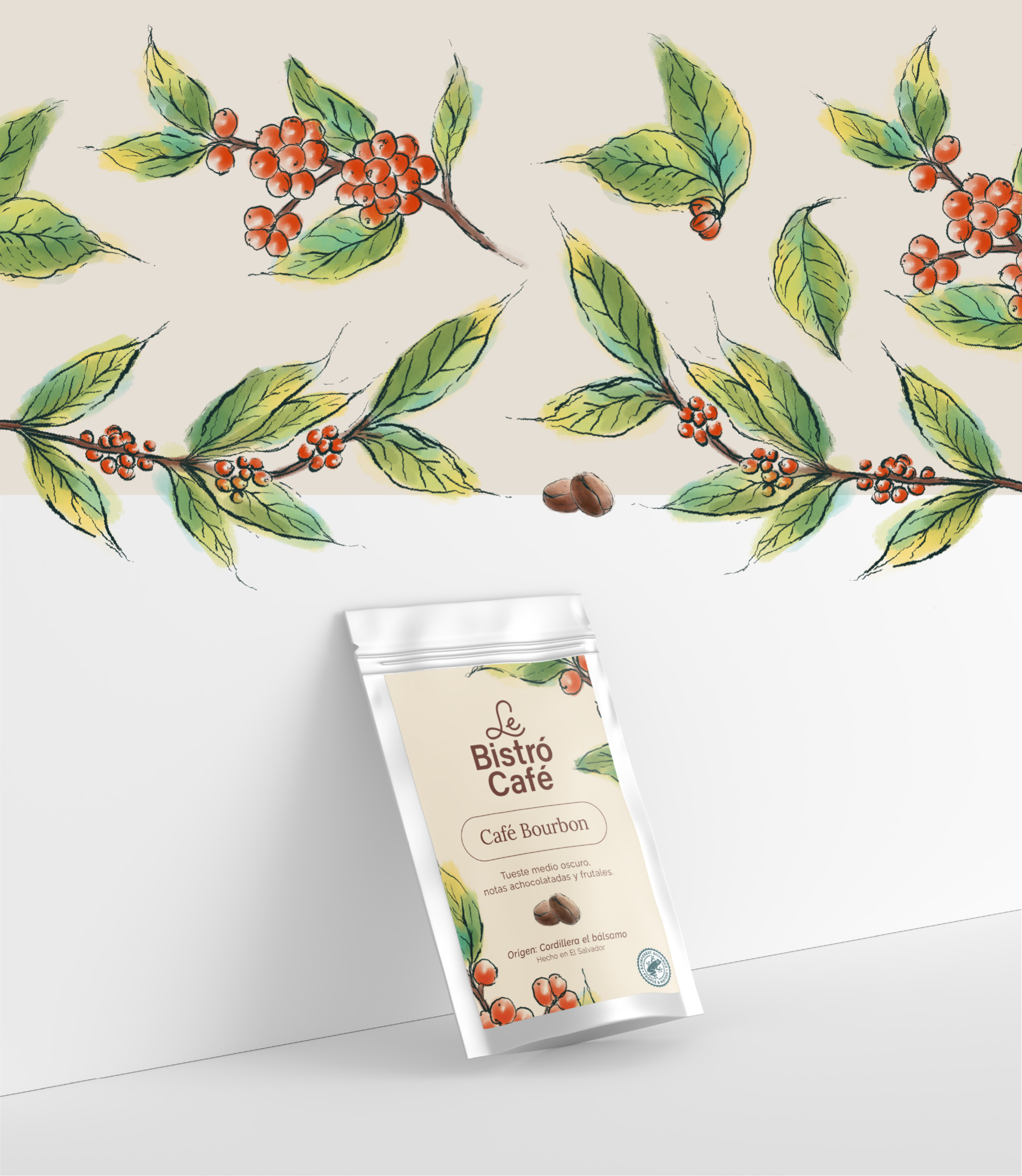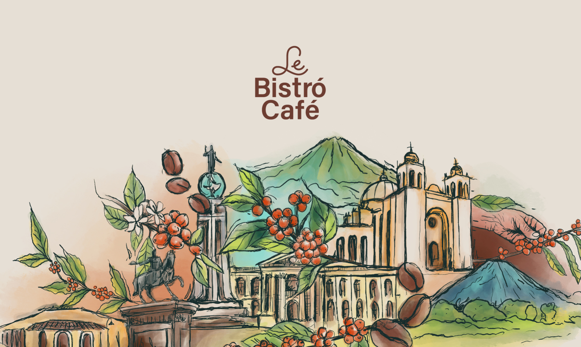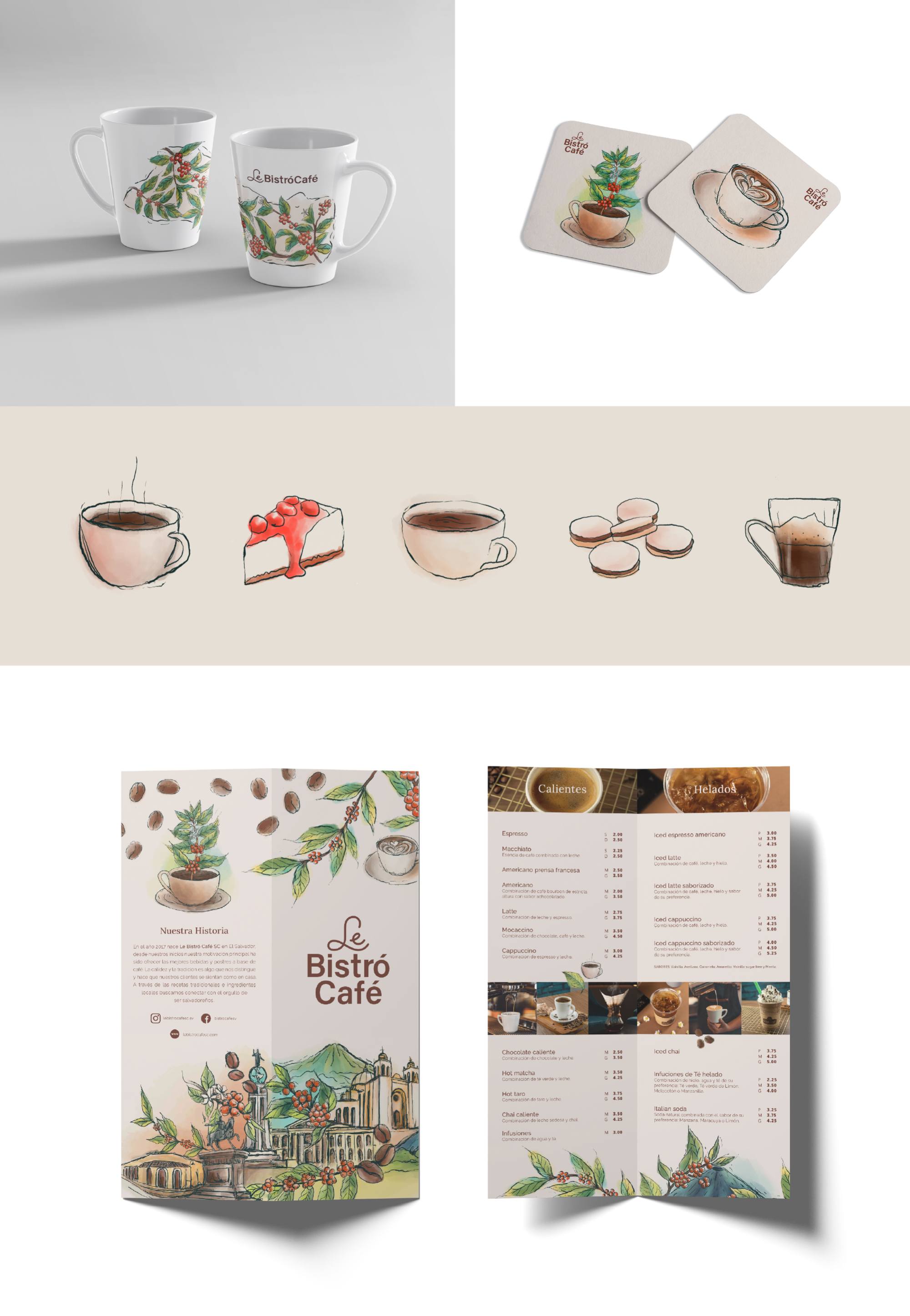 El rebranding de Le Bistró Café buscó darle un sentido moderno a la marca con un logotipo limpio y versátil que transmite frescura y contemporaneidad. La verdadera riqueza de la identidad está en su universo visual, construido a partir de ilustraciones hechas a mano de monumentos, paisajes y cafetales salvadoreños, acercando al público al origen y la autenticidad del café local. La estrategia combinó la elegancia de un bistró moderno con la esencia salvadoreña, logrando un equilibrio entre lo internacional y lo propio.