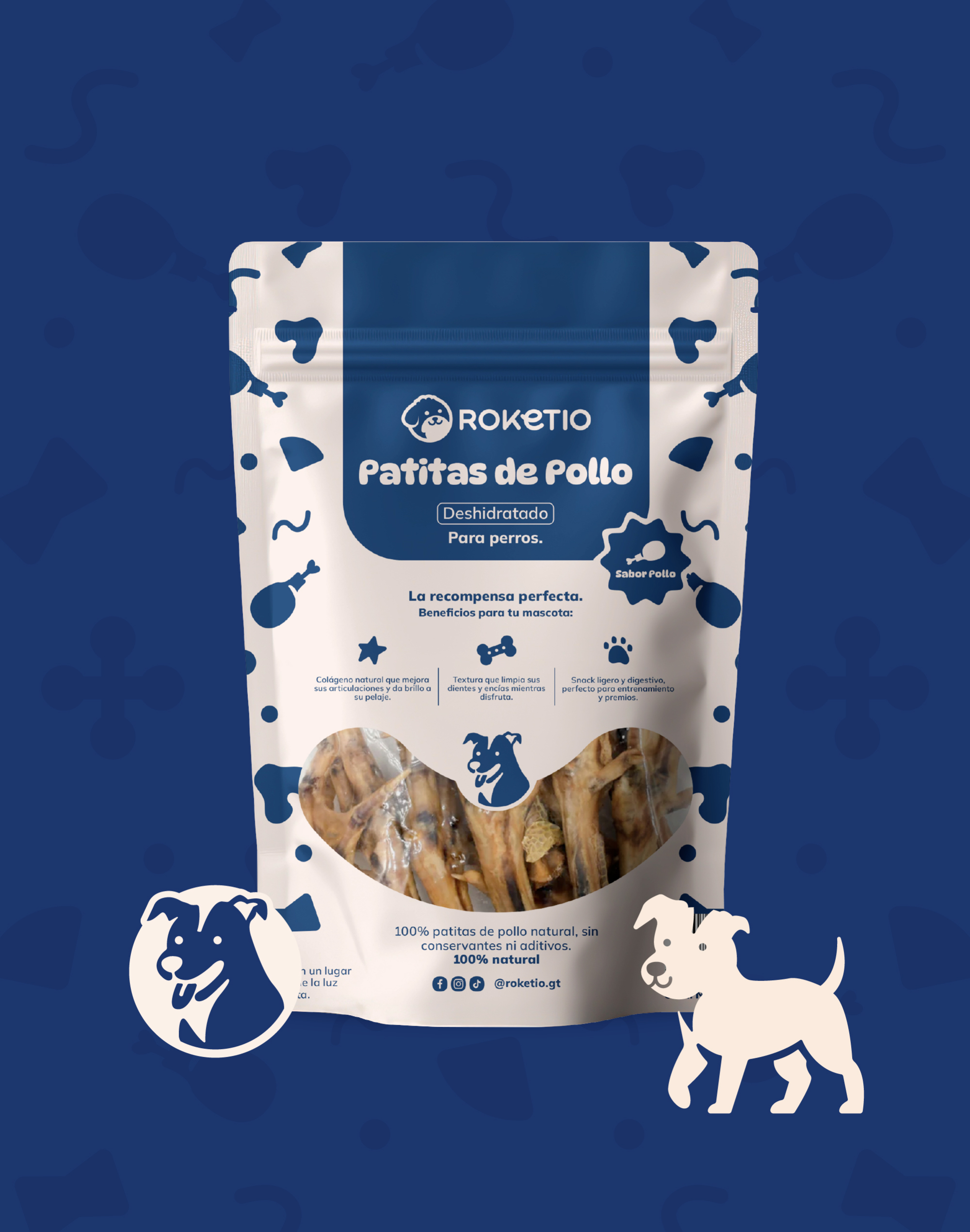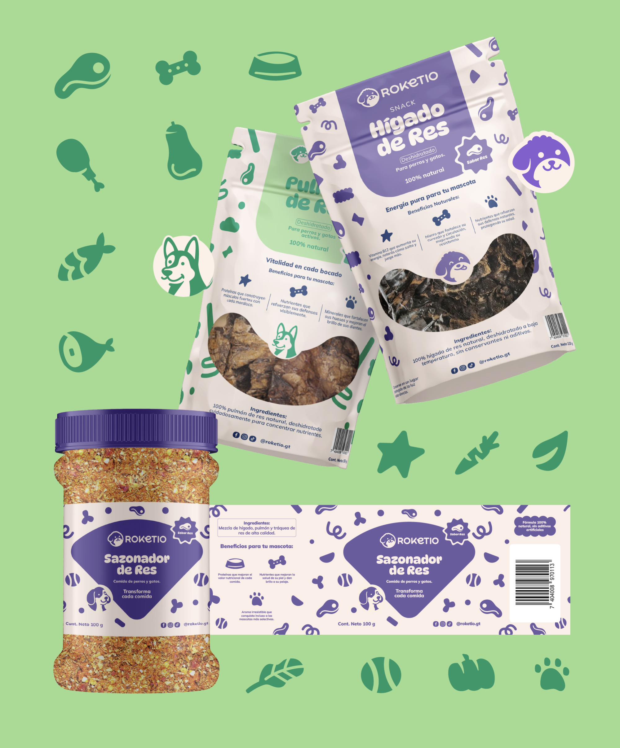 El proyecto de branding para Roketio nació con la misión de transformar la forma en que los dueños consienten a sus mascotas, creando una marca de snacks y sazonadores 100% naturales que unen nutrición, diversión y conexión emocional. El concepto “Crunch, crunch… ¡acción!” refleja la energía y vitalidad que los peludos viven en cada bocado, convirtiendo la alimentación en un momento de juego y complicidad. La identidad se construyó con un universo gráfico dinámico: un logotipo versátil acompañado de personajes ilustrados que aportan humor y personalidad, junto a una paleta vibrante y tipografías enérgicas.