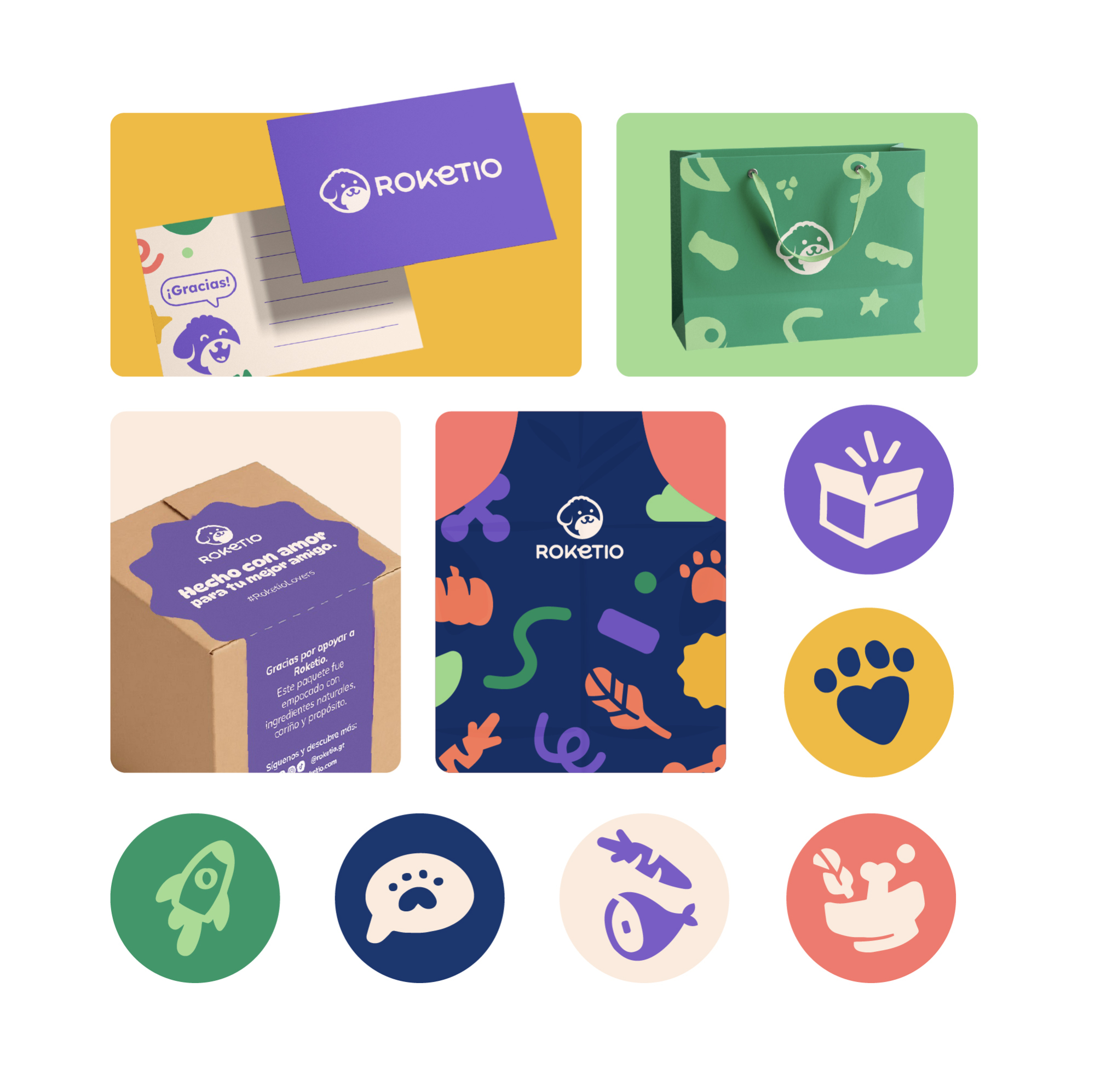 El sistema visual se aplicó en empaques llamativos, etiquetas, tarjetas de agradecimiento, stickers de seguridad, viñetas, uniformes, camisetas, delantales e iconografía digital para redes sociales. El resultado es una marca fresca y memorable que proyecta a Roketio como innovadora, confiable y divertida, capaz de construir comunidad entre mascotas y dueños.